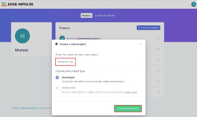 Head over to the Edge Impulse login page and log in. Create a new project, and name it something like Christmas Tree.