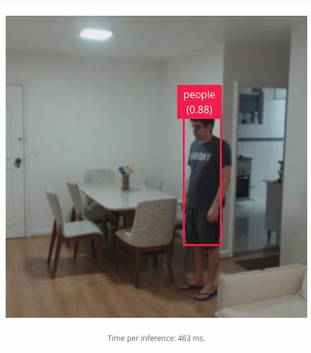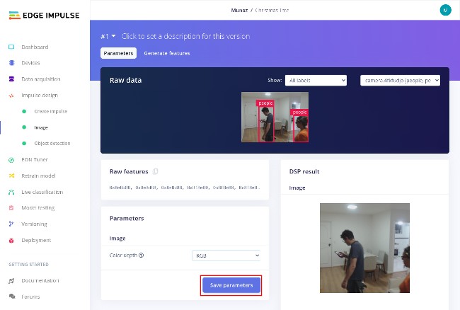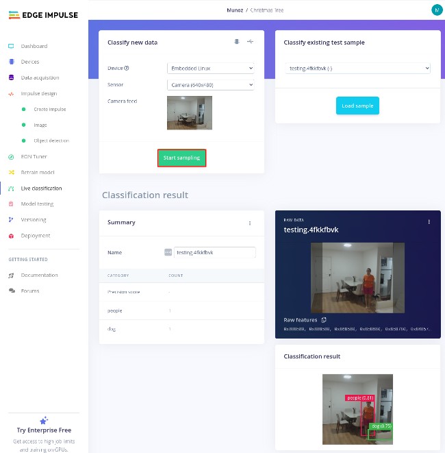 At this point, your model is complete! You can test from the Edge Impulse Portal. From the left menu, select Live Classification to see a live feed of your camera. Select Start sampling. If someone walks in front of the camera, it should now apply the people label to them, complete with their own box: