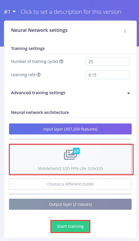 In the Neural Network settings, Find the Neural network architecture and change it to MobileNetV2 SSD FPN-Lite 320x320 like the picture below and start training: